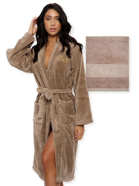 • Verwen jezelf met ingetogen luxe met onze Taupe Bundle, met een zachte fleece badjas en een bijpassende katoenen handdoek. Beide items kunnen gepersonaliseerd worden met fijne borduursels, waardoor deze tijdloze set het perfecte cadeau of een onmisbaar selfcare-item is.