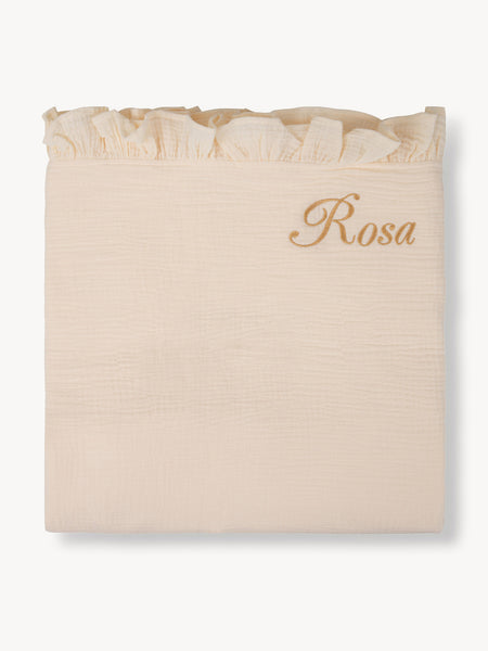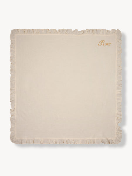 Besides being a real eye-catcher, the ruffle hydrophilic cloth is also the answer to everything! As an extra blanket in the stroller, for over your shoulder to catch little burps or as a towel after a warm bath. And how nice is this personalised hydrophilic ruffle cloth made of lovely soft cotton: Ideal for your newborn baby. Make it even more personal by having it personalised with the most beautiful embroidery thread.
