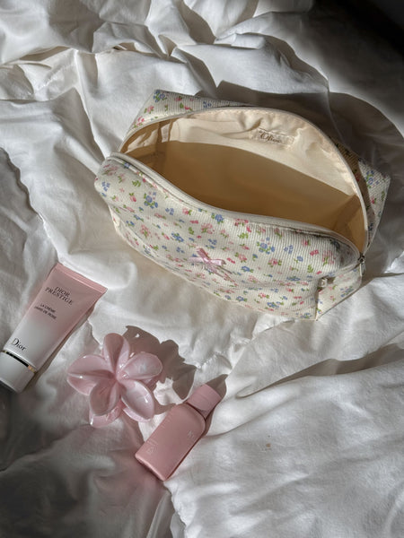 • Beauty in a bag! Our make-up box is perfect for storing your favourite make-up and skincare essentials. Small details like the ribbon and floral print make this make-up pouch really cute. Thanks to its compact size it fits easily into your suitcase. Personalise the make-up box with your name or initials. Each make-up box is embroidered with love in our own atelier using the finest embroidery threads. Treat yourself or someone special to this gorgeous personalised make-up box. Make your gift extra special with our gift packaging we are happy to take care of everything for you. Have you like us fallen in love with this make-up box? Complete the set with a matching hair tool bag or make-up pouch. Order yours today!