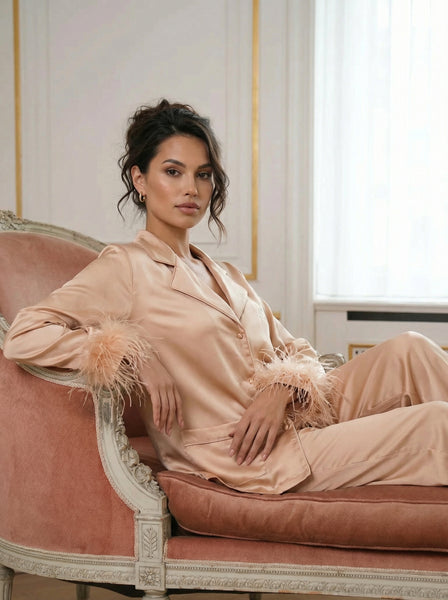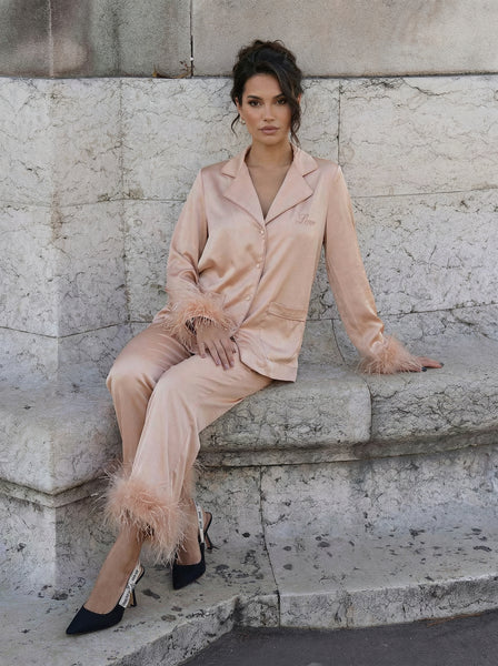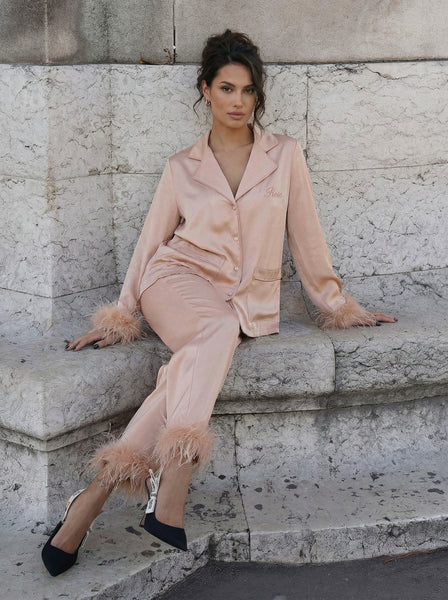 - The Pyjama Feather Nude of the "Holiday Collection" by Rose Bertram is a true fashion icon. The fabric is soft and the feathers give the pyjama that extra chic look to feel cozy at home and looking fabulous at the same time! Make your item unique by personalise it with our lovely embroidery colours.